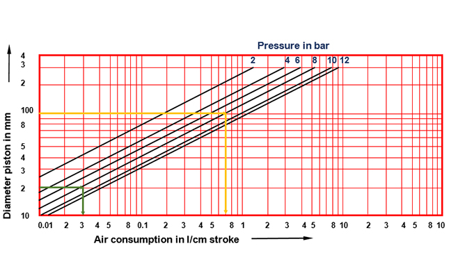 例如,缸徑D為100mm(10cm)、行程L為100mm(10cm)的氣缸,動(dòng)作頻率N為60周/min,d=10mm(1cm),ld=60mm(6cm),